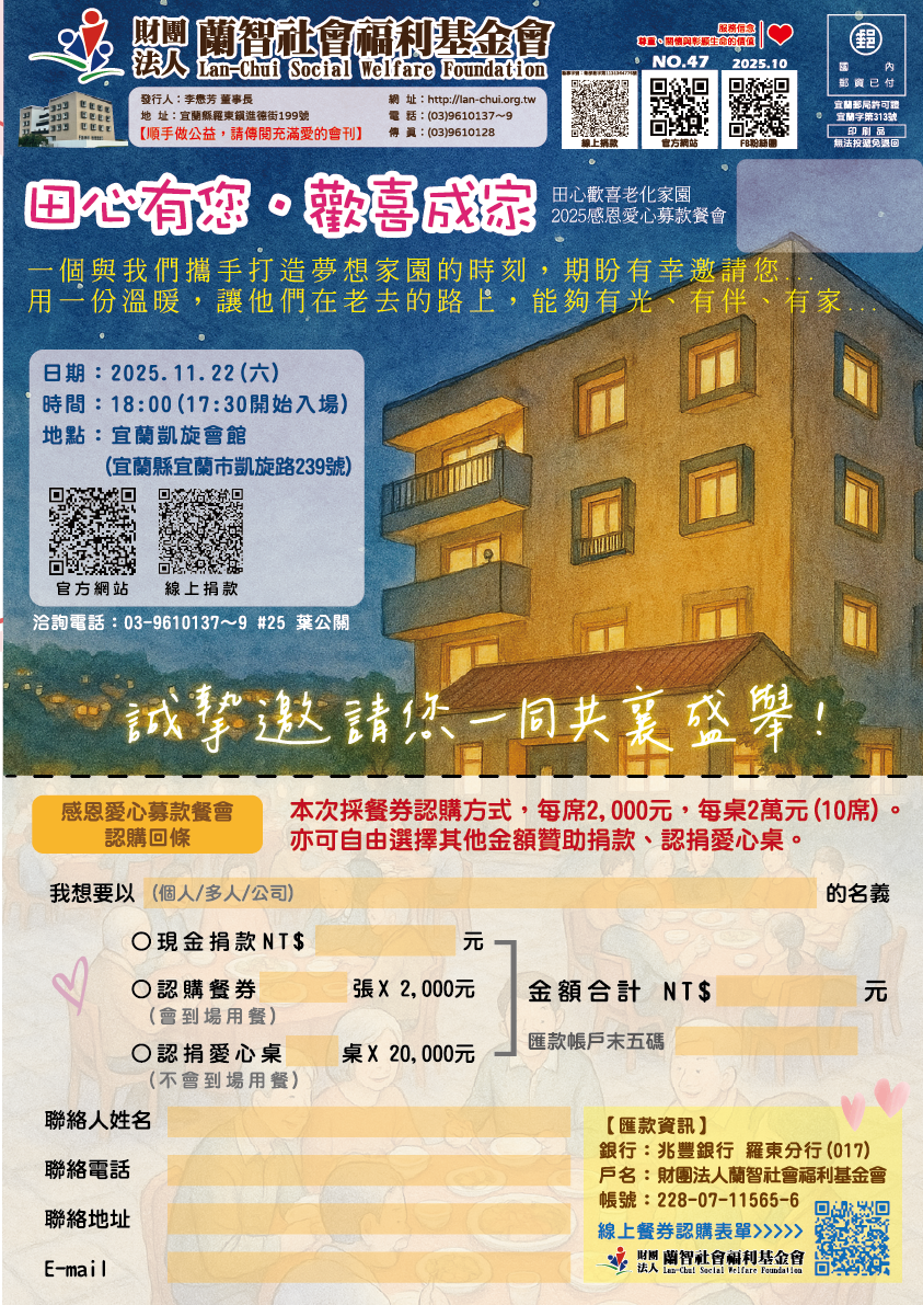 蘭智會刊 蘭智基金會第二十七期會刊 蘭智基金會第二十八期會刊 蘭智基金會第二十九期會刊 蘭智基金會第三十期會刊 蘭智基金會第三十一期會刊 蘭智基金會第三十二期 蘭智基金會第三十三期會刊 蘭智基金會第三十四期會刊 蘭智基金會第三十五期會刊 蘭智基金會第三十六期會刊 蘭智基金會第三十八期會刊 蘭智基金會第三十九期會刊 蘭智基金會第四十期會刊 蘭智基金會第四十一期會刊 蘭智基金會第四十二期會刊 蘭智基金會第四十三期會刊 蘭智基金會第四十四期會刊 蘭智基金會第四十五期會刊 蘭智基金會第四十六期會刊 蘭智基金會第四十七期會刊 蘭智基金會第四十八期會刊 蘭智基金會第四十九期會刊 蘭智基金會第五十期會刊 蘭智基金會第五十一期會刊 捐款資訊 劃撥戶名:財團法人蘭智社會福利基金會 劃撥帳號:19985694 兆豐國際商業銀行羅東分行 戶名:財團法人蘭智社會福利基金會 銀行代碼 : 017 帳號:228-07-11565-6 蘭智玩美布工坊(庇護工場)地址 : 265宜蘭縣羅東鎮進德街199號電話 : (03)9515308 傳真 : (03)9610128蘭陽智能發展學苑地址 : 269宜蘭縣冬山鄉柯林村安農二路208號電話 : (03)9530901 傳真 : (03)9530903蘭智樟樹園小作所烘焙坊(社會日間作業所)地址 : 宜蘭縣羅東鎮中山路四段53號電話 : (03)9530129 傳真 : (03)9530133蘭智蘭坊複合式商店(社會福利館)地址 : 260宜蘭市同慶街95號電話 : (03)9365995