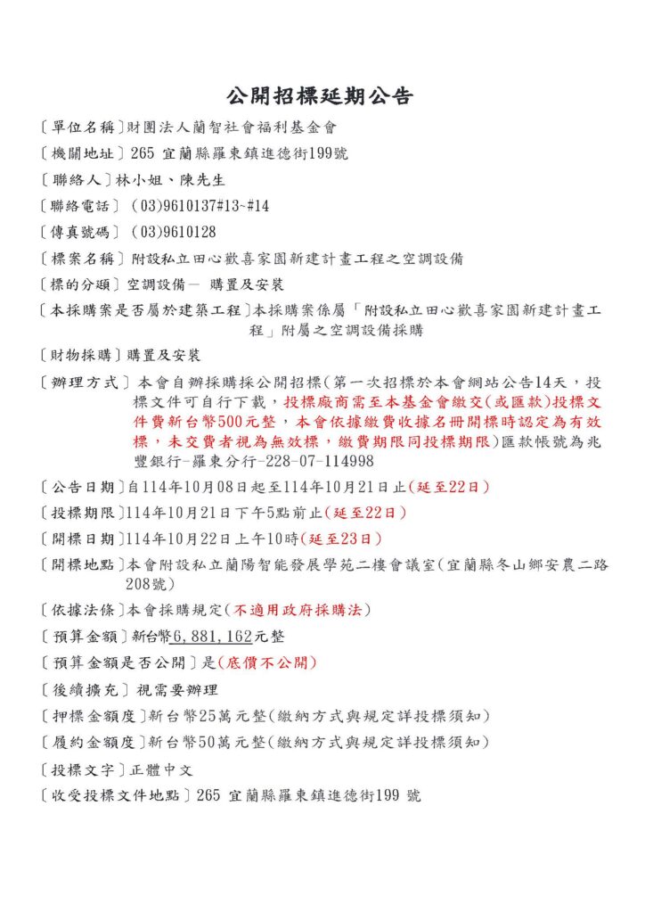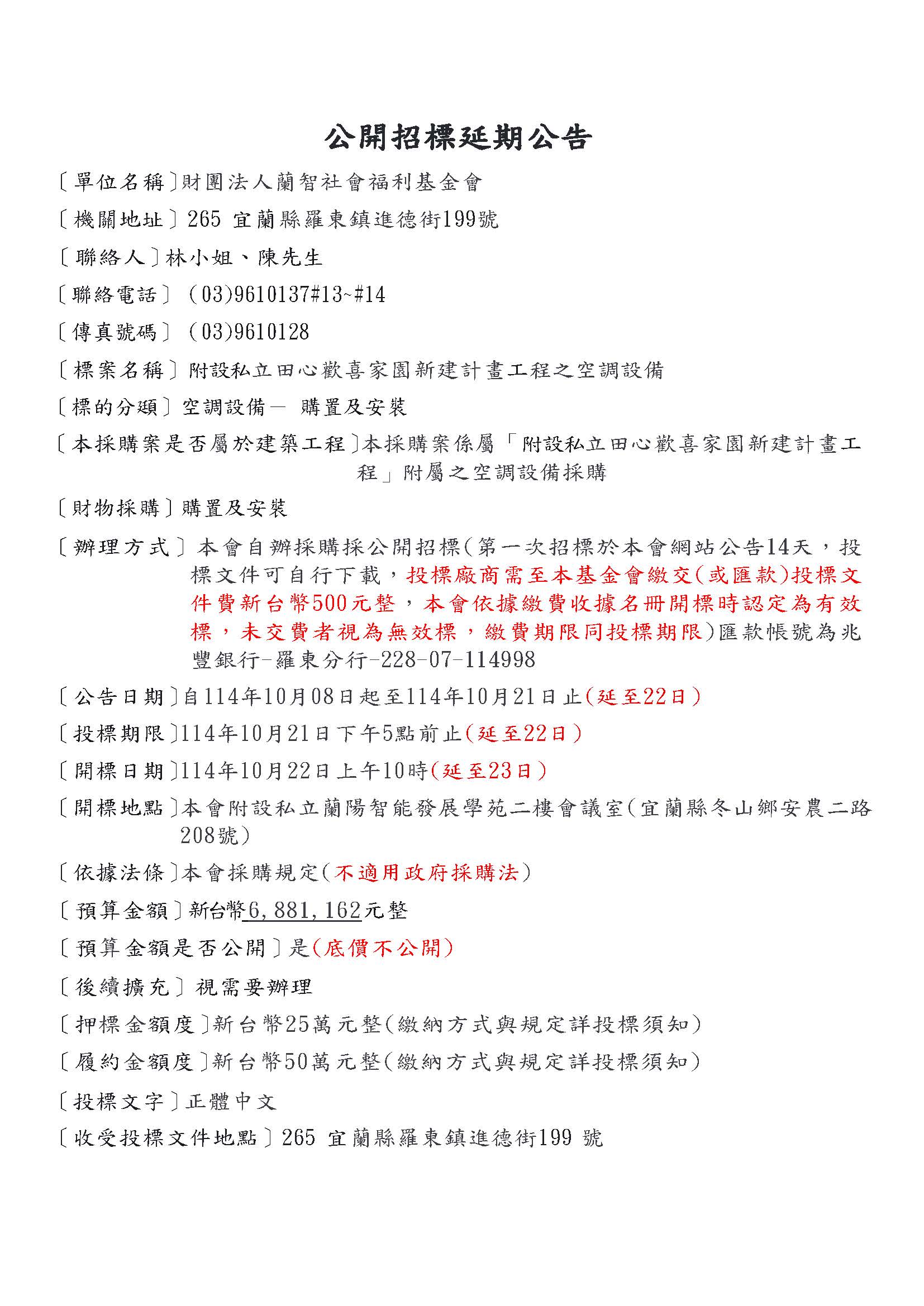 【114.10.22 公開招標延期公告】附設私立田心歡喜家園新建計畫工程之空調設備